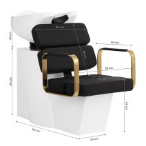 Profilované kreslo poskytuje dostatočnú bedrovú oporu a tým vysoký komfort používania. Kovové podrúčky v odtieňoch čiernej s geometrickým tvarom umožňujú správne polohovanie ramien zákazníka . Výplň z odolnej peny odolnej proti deformácii a čalúnenie z na dotyk príjemnej syntetickej kože v odtieňoch béžovej zaisťuje odolnosť nábytku, jednoduché čistenie a pohodlné používanie po dlhú dobu . Originálny elegantný vzhľad jednotky na umývanie vlasov dodáva interiéru jedinečný výraz. Sada obsahuje kompletné armatúry v odtieňoch čiernej, vrátane vodovodnej batérie, sprchr hlava a špeciálne hadice poskytujú kompletnú sadu nástrojov pre prácu .