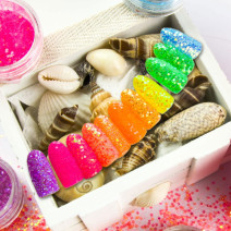 Aplikácia pri géloch a gél lakoch : aplikujeme pomocou štetca na gél do výpotku farebného gélu, alebo gél laku. Zafixujeme vrchným gélom, alebo gél lakom.