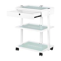 estetický stolík na kozmetický prístroj, vyrobený z kovu a skla, s kolieskami. má štyri sklenené police.